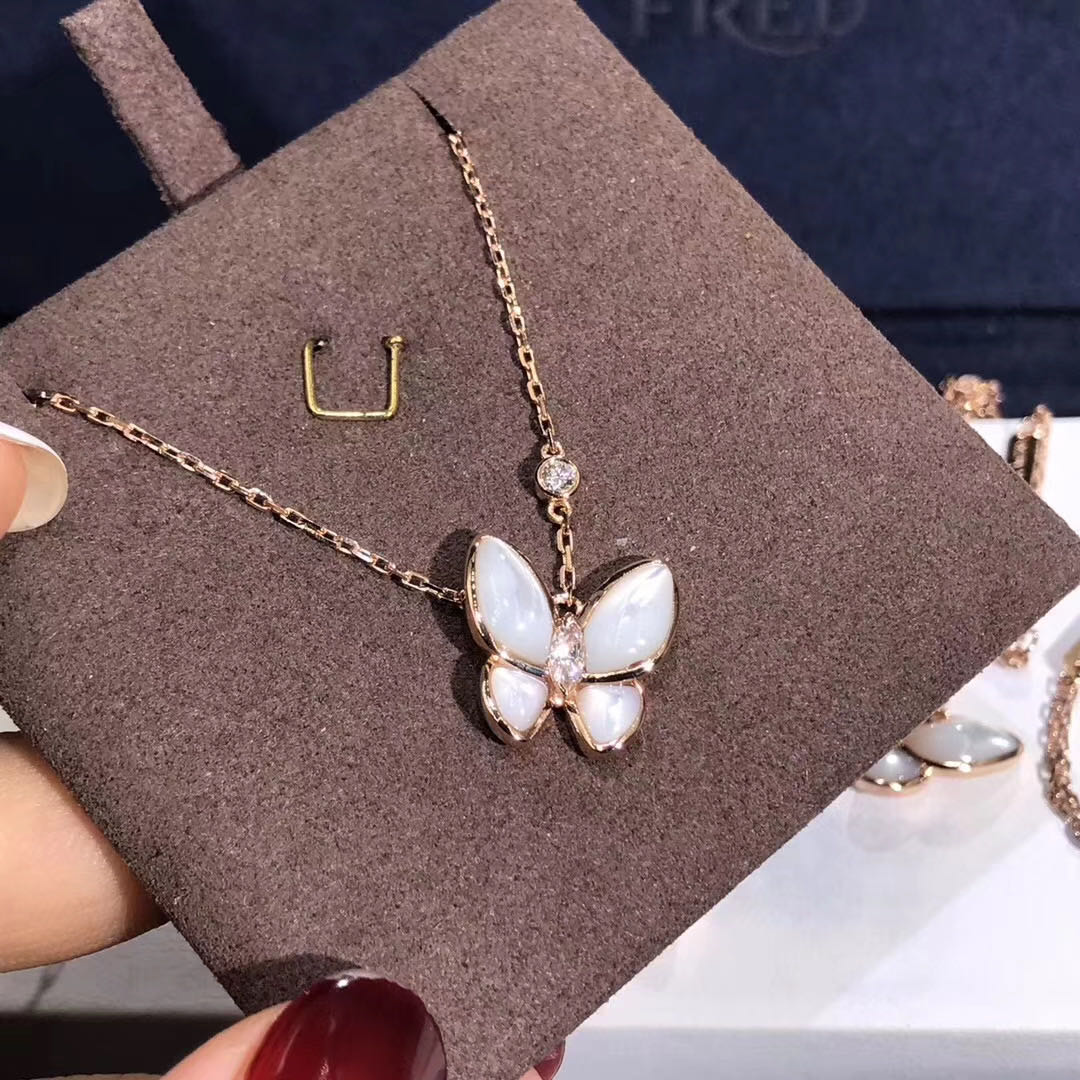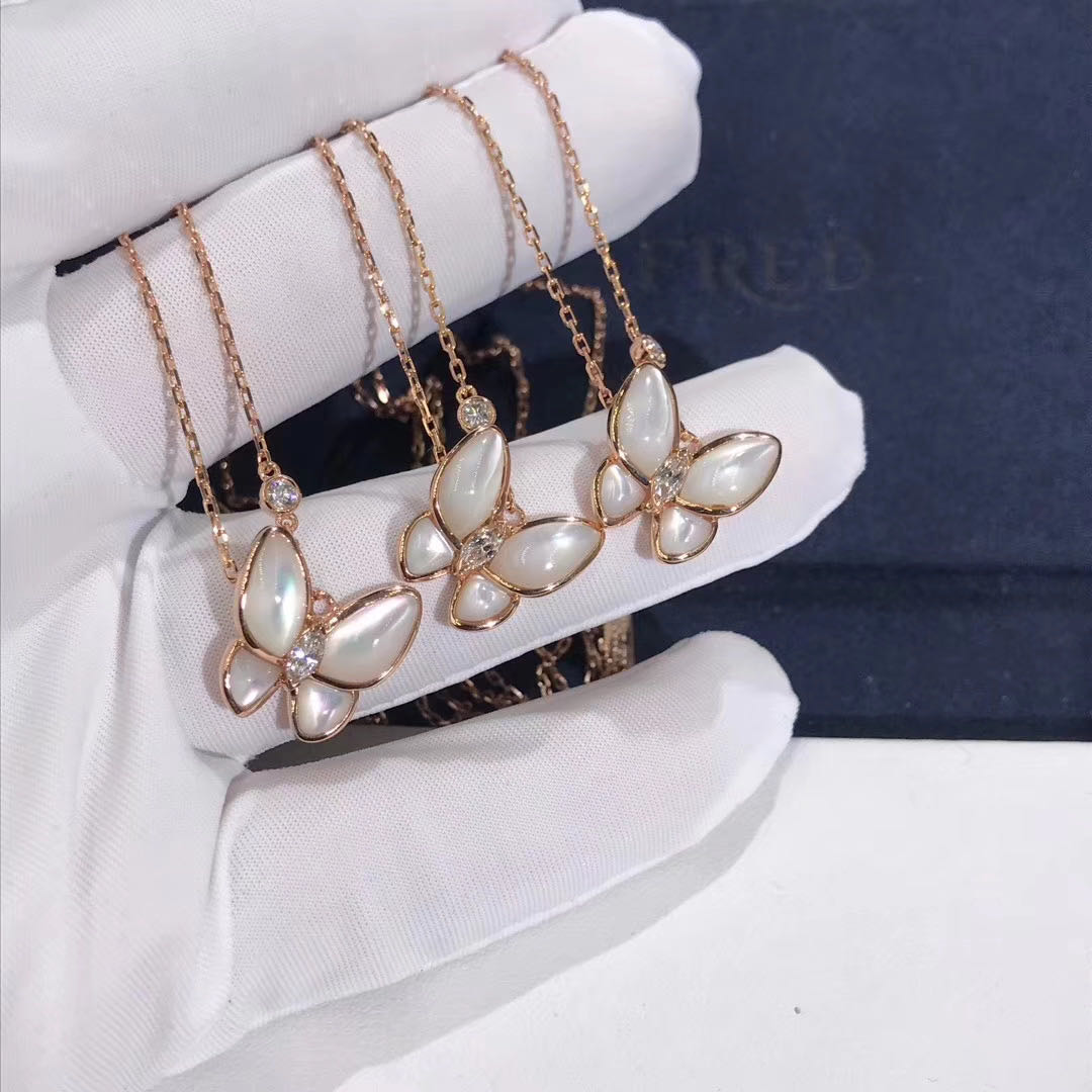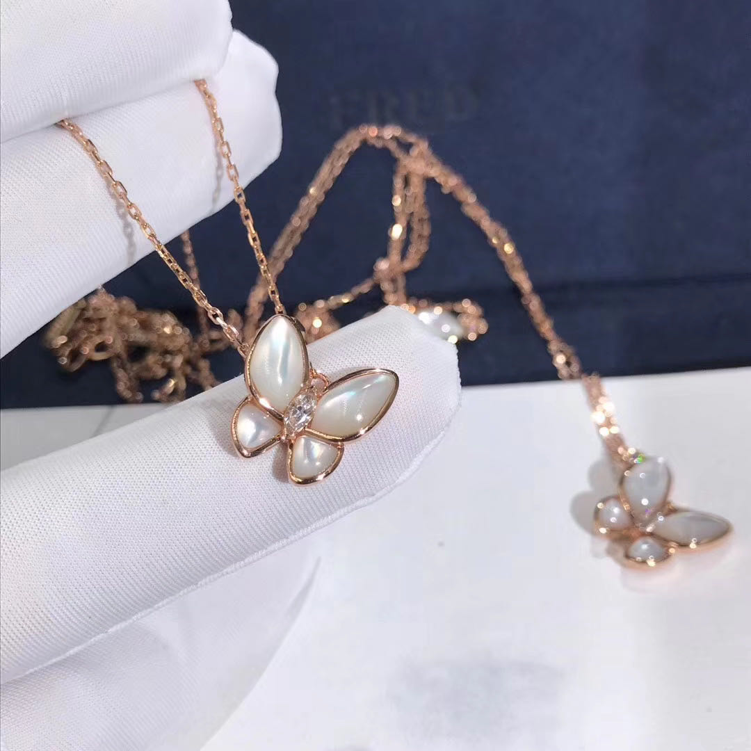 18KT VCA Two Butterfly Pendant Necklace with Mother-of-Pearl and Diamonds