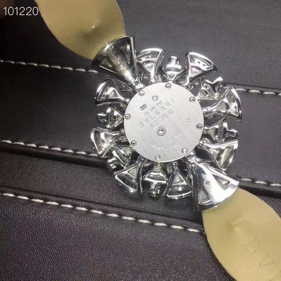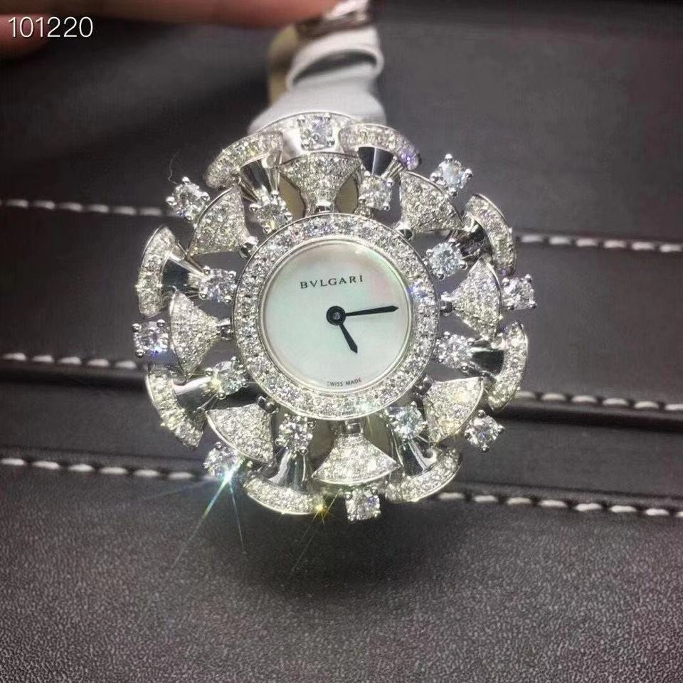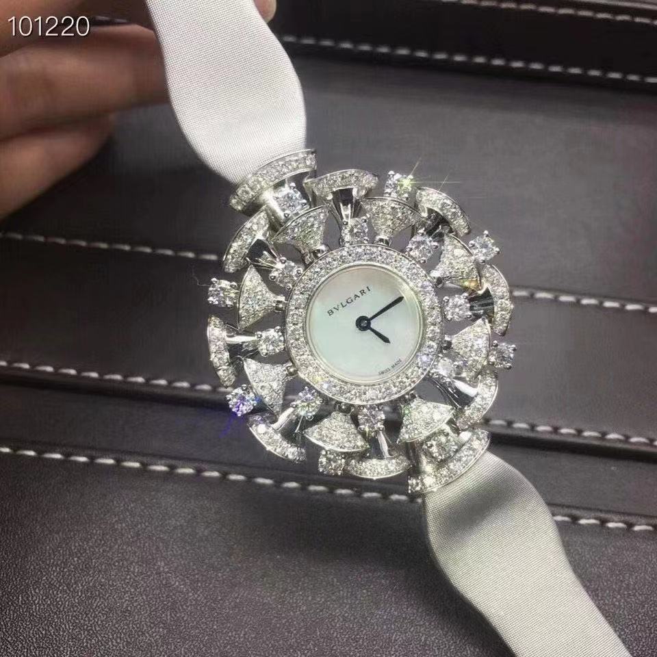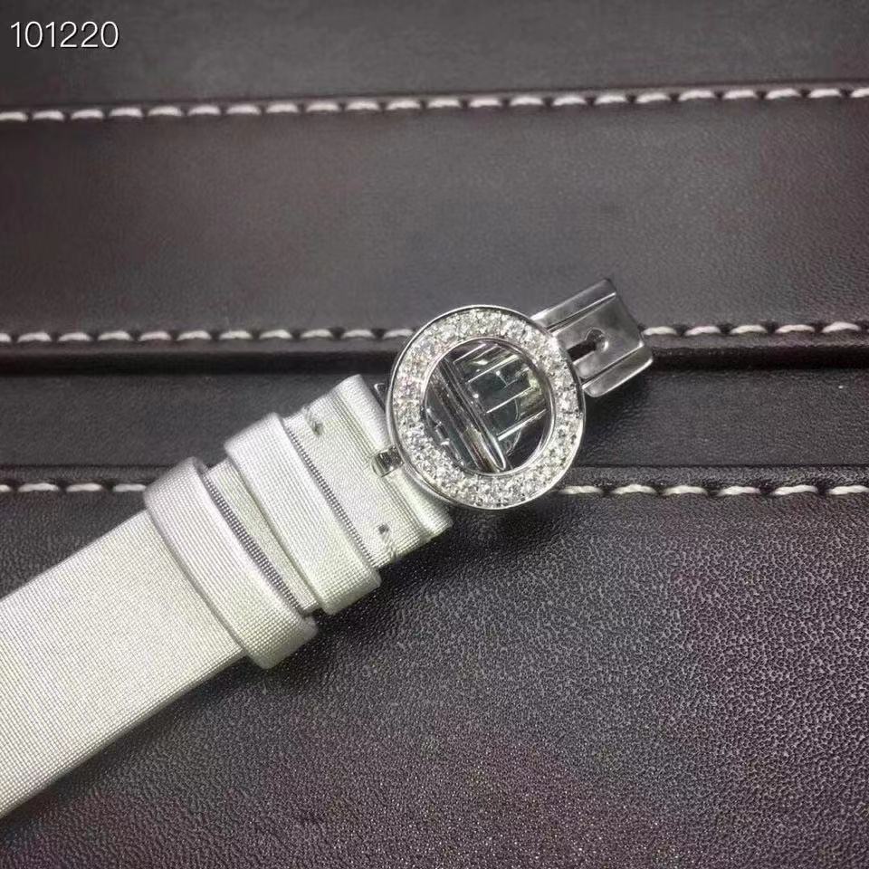 Framing the radiance of a gleaming dial with the delicacy of the iconic fan-shaped motif, the DIVAS’ DREAM timepiece reveals the multifaceted shades of contemporary women. Inspired by feminine elegance and by the enchanting allure of the eternal city, the DIVAS’ DREAM timepiece pays homage to the most glamorous divas with an unmistakable Roman spirit. Quintessentially feminine and refined, the jewelry watch is sculpted capturing the charm of the Caracalla Baths marble and the sensual curves of its fan-shaped mosaics, reflecting the very essence of Italian beauty. DIVAS’ DREAM watch with quartz movement, 39mm 18 kt white gold case set with brilliant and round-cut diamonds, white mother-of-pearl dial, grey satin strap and 18 kt white gold buckle set with brilliant-cut diamonds.