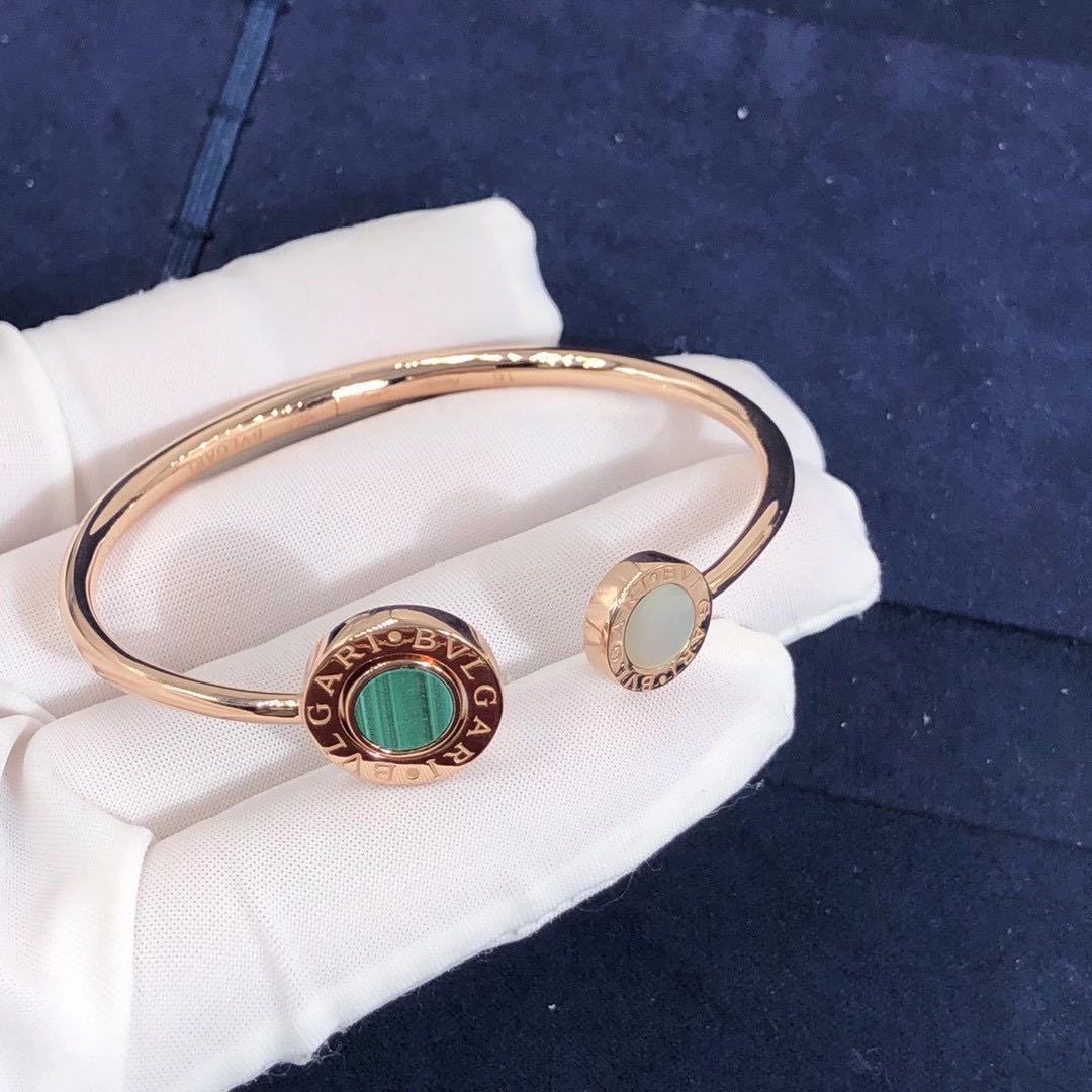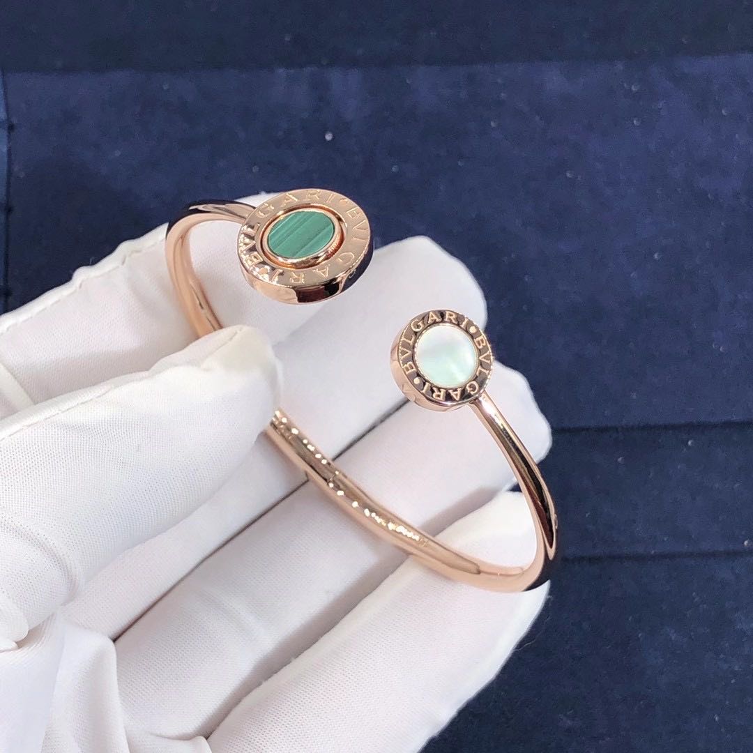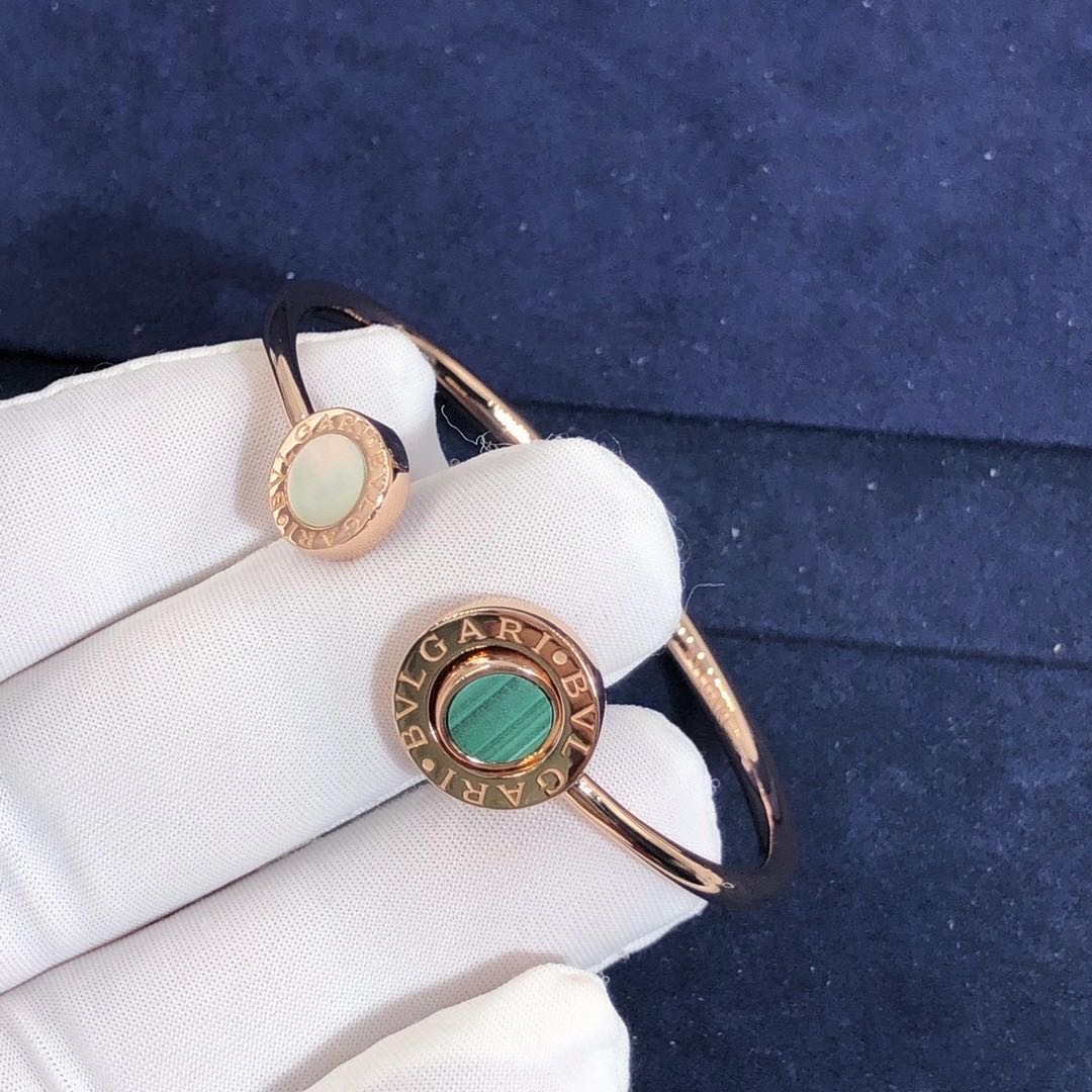 Bvlgari Bvlgari 18k rose gold mother of pearl malachite and black onyx flip bracelet. Features a mother of pearl stone on one end and a black onyx stone which flips to malachite on the other end.