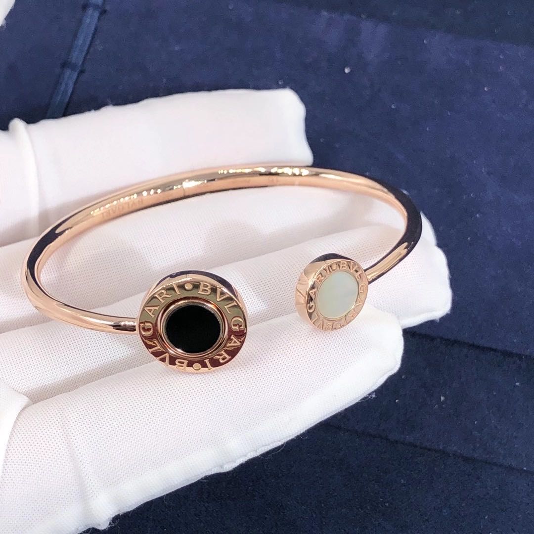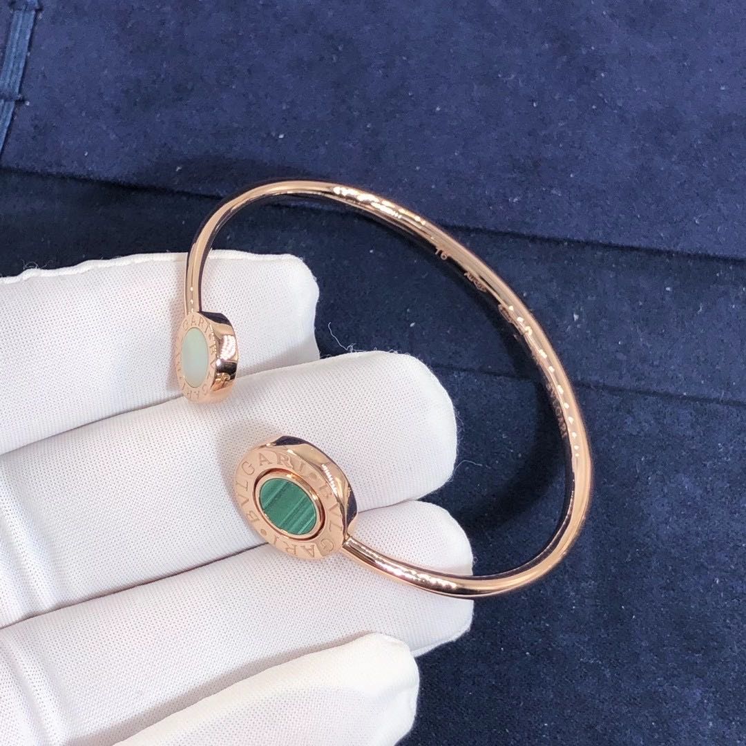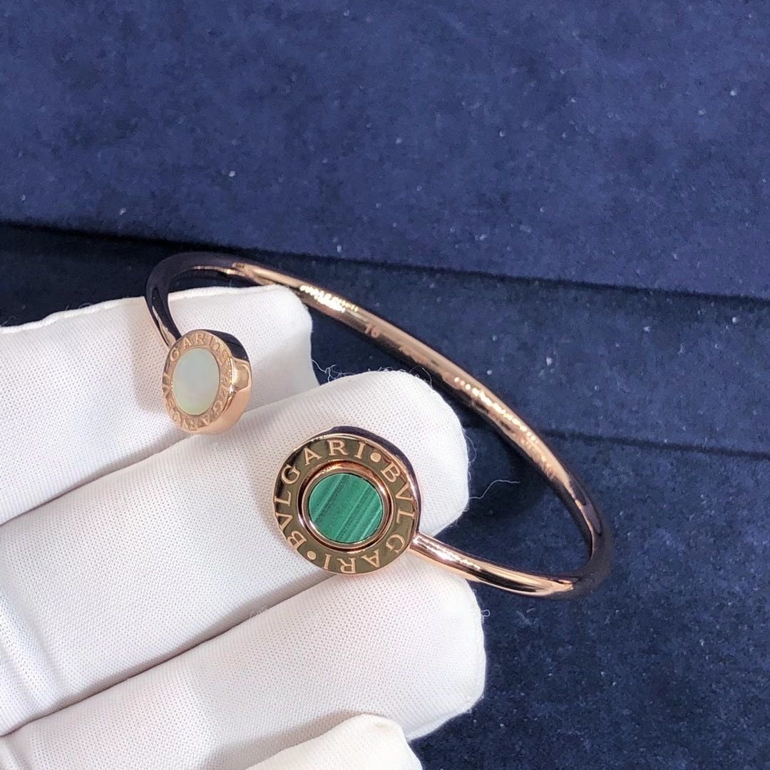 Bvlgari Bvlgari 18k rose gold mother of pearl malachite and black onyx flip bracelet. Features a mother of pearl stone on one end and a black onyx stone which flips to malachite on the other end.