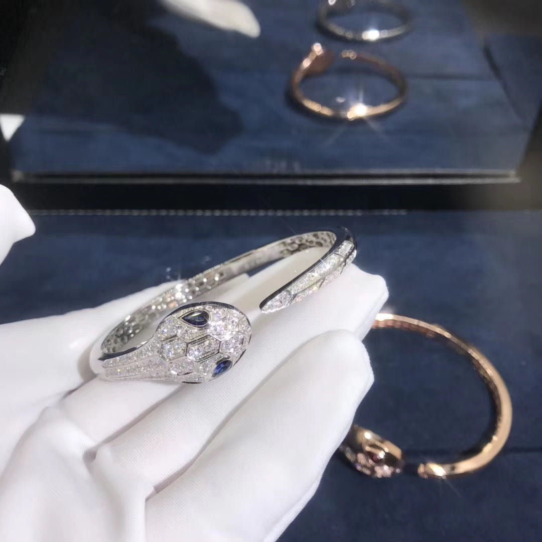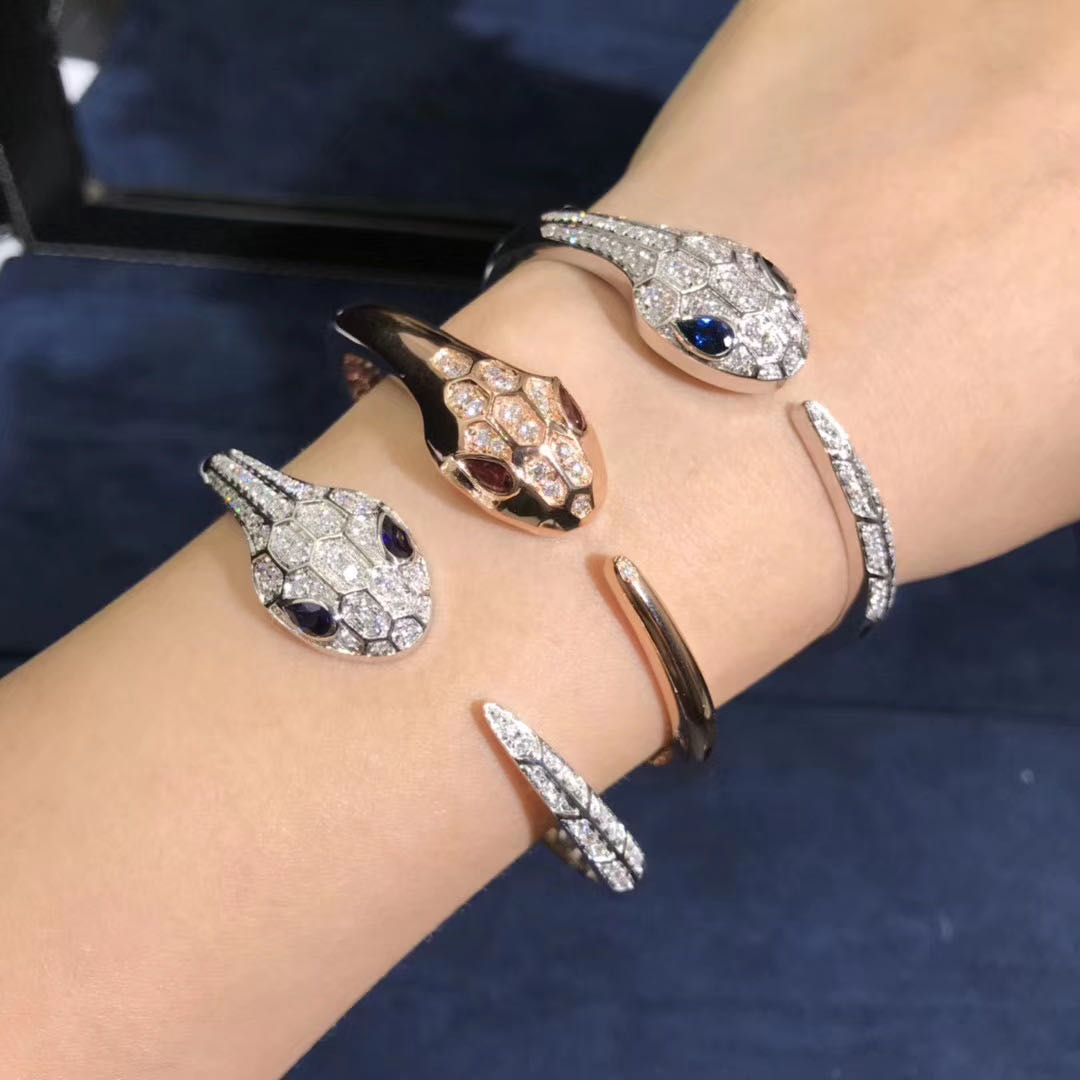 Capturing the power of attraction, the Bvlgari Serpenti bracelet glorifies the head of the snake in a jeweled design that sparkles with glamour and sophistication. Inspired by the sensuality of a woman’s gaze, Bulgari reinterprets its spirit animal, focusing on the magnetic power of the eyes and channeling their irresistible ability to seduce.
