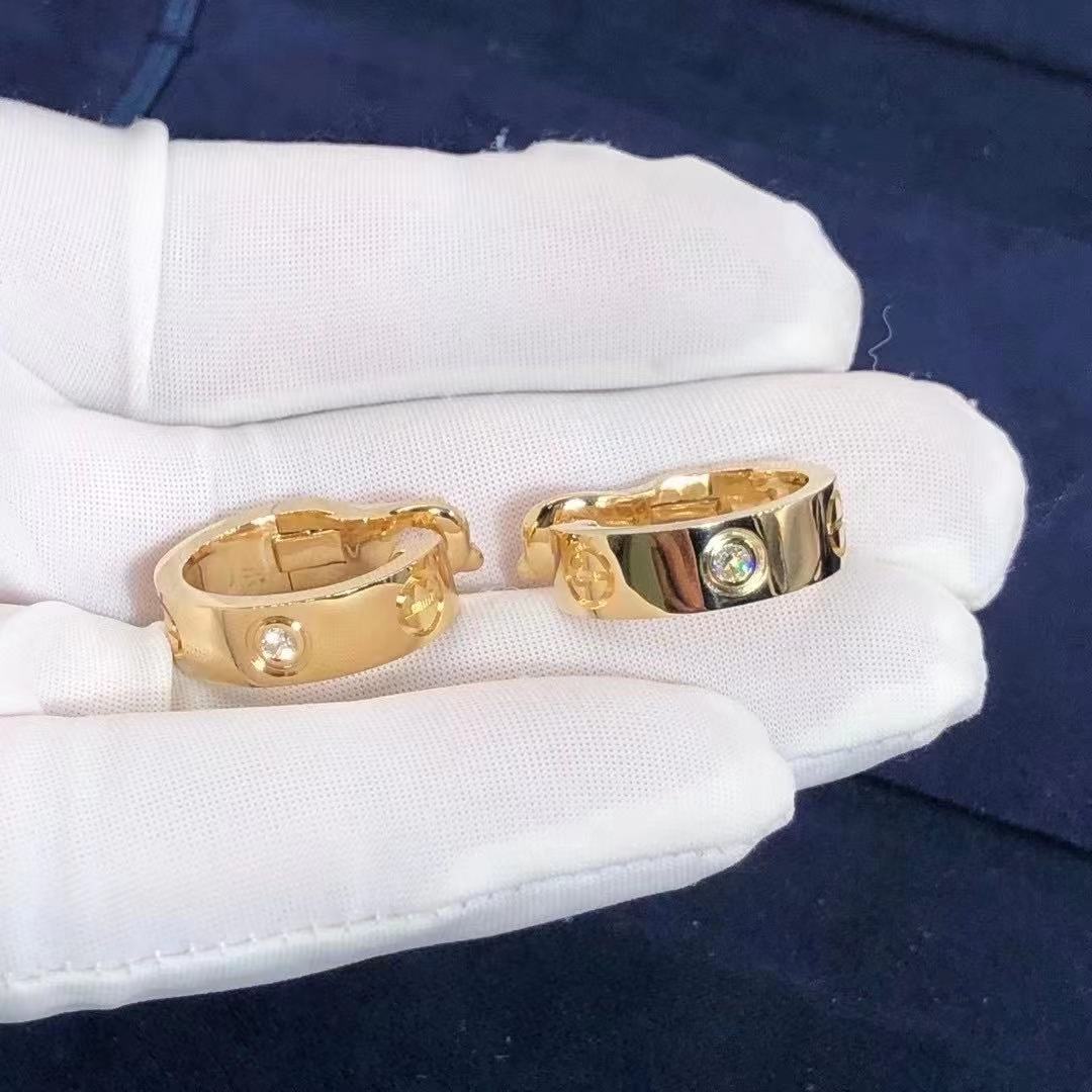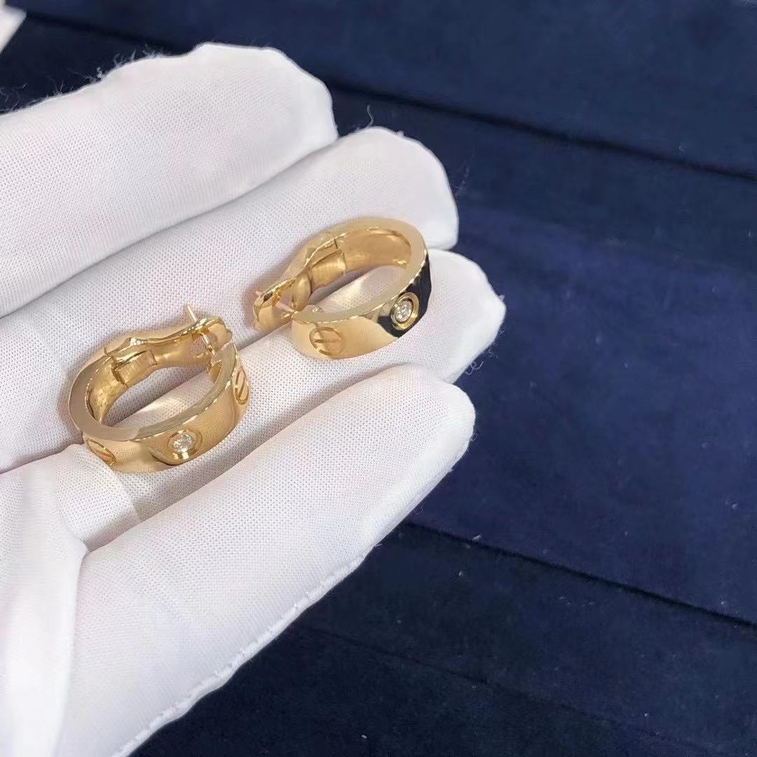 A pair of 18k yellow gold diamond earrings from the iconic Love collection by Cartier. Each hoop earring is set with 1 round brilliant cut diamonds. The earrings are 18mm in length and 5.7mm in width and feature a post and lever hinged fittings.