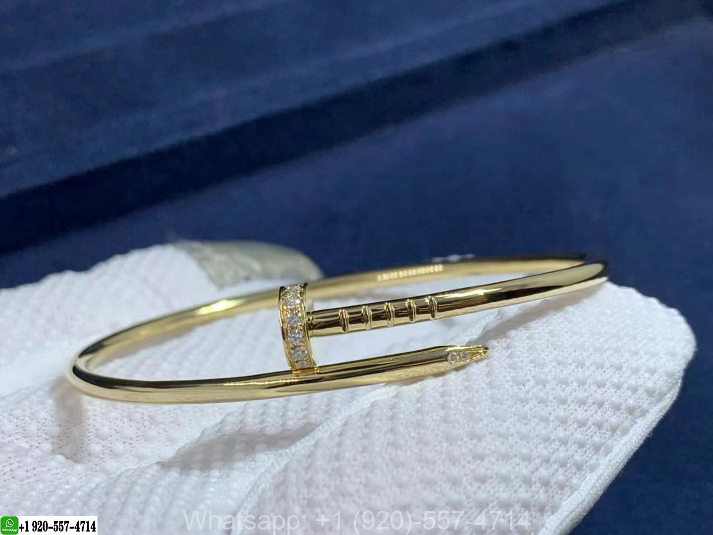 An iconic 18k yellow gold small model Cartier diamond bracelet from the Juste Un Clou collection. The bracelet is in the style of a nail and has 20 round brilliant cut pave diamonds set in the head and tip, totalling 0.18ct.