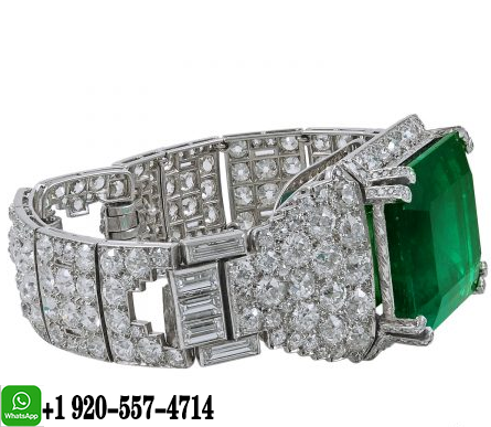 An outstanding Cartier bracelet comprising a phenomenal large rectangular-cut Colombian emerald weighing approx. 58.98 carats surrounded by an opulence of round cut diamonds and an old baguette-cut diamond bracelet, finely crafted in platinum, signed Cartier.