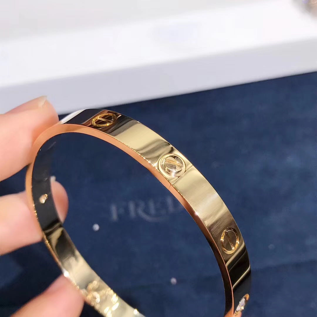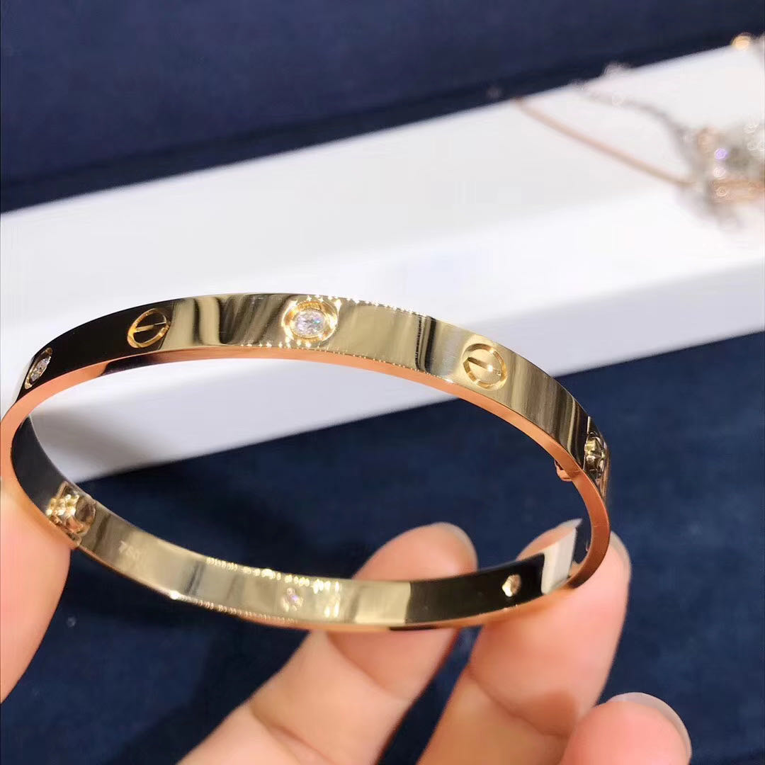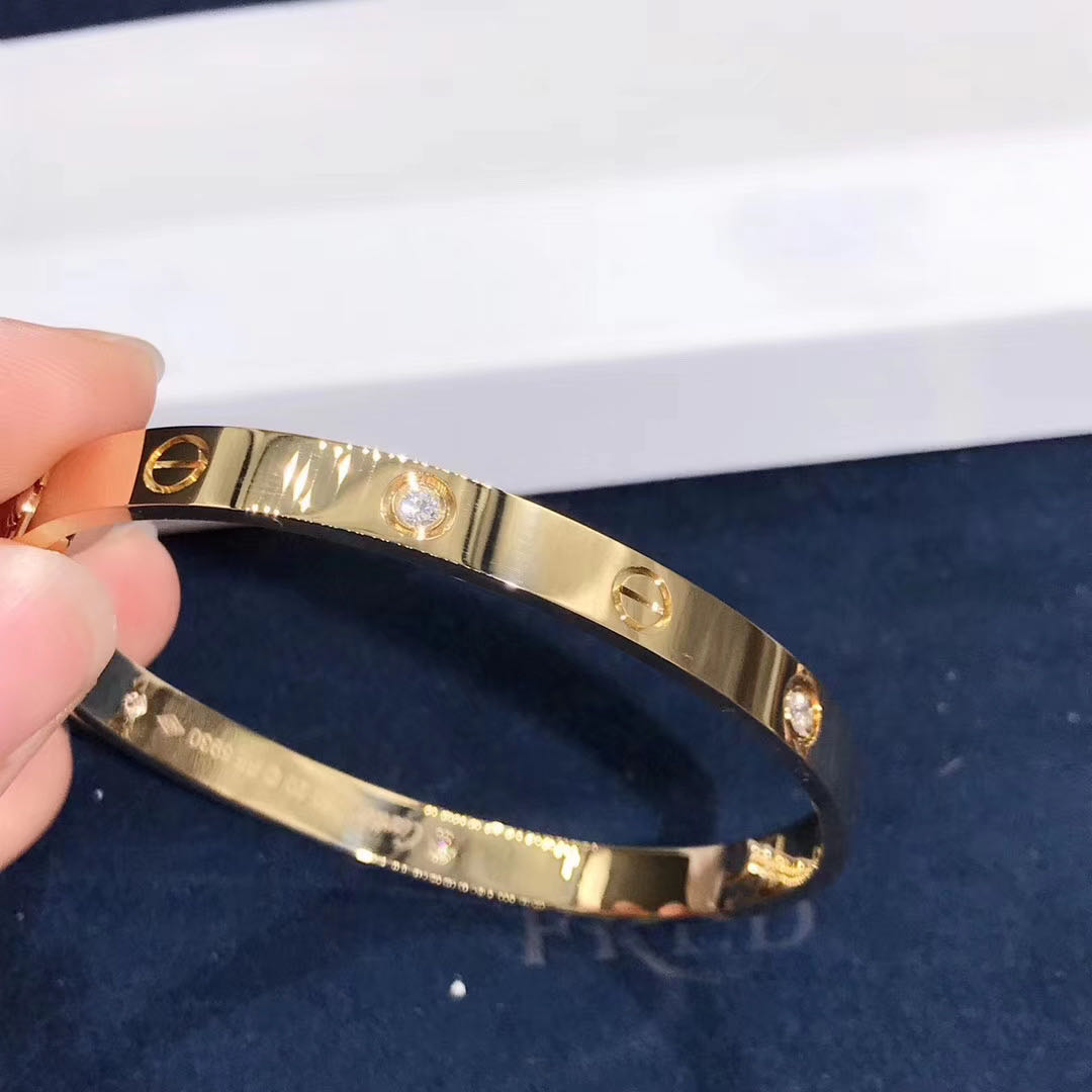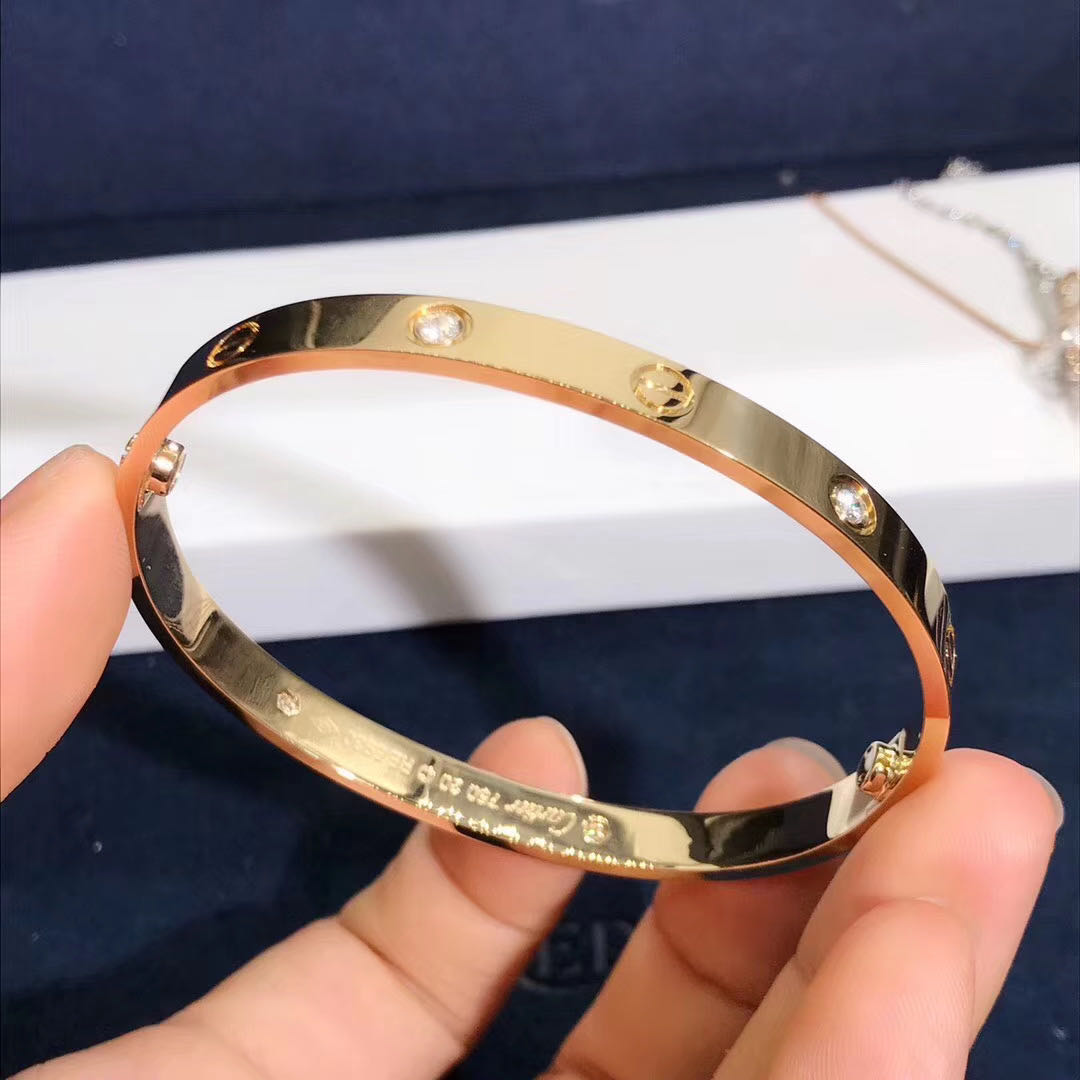 Part of Cartier’s classic LOVE collection, this stunning bangle bracelet is crafted of 18 karat yellow gold with a four diamonds and features the engraved Love symbol throughout. This iconic bracelet makes for the perfect accessory for any occasion, with the classic style of Cartier!