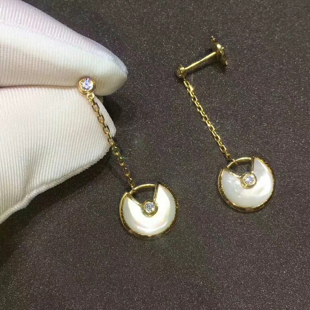 Amulette de Cartier earrings, XS model, 18K yellow gold, white mother-of-pearl, set with 4 brilliant-cut diamonds totaling 0.14 carats. Diameter of motifs: 12 mm.