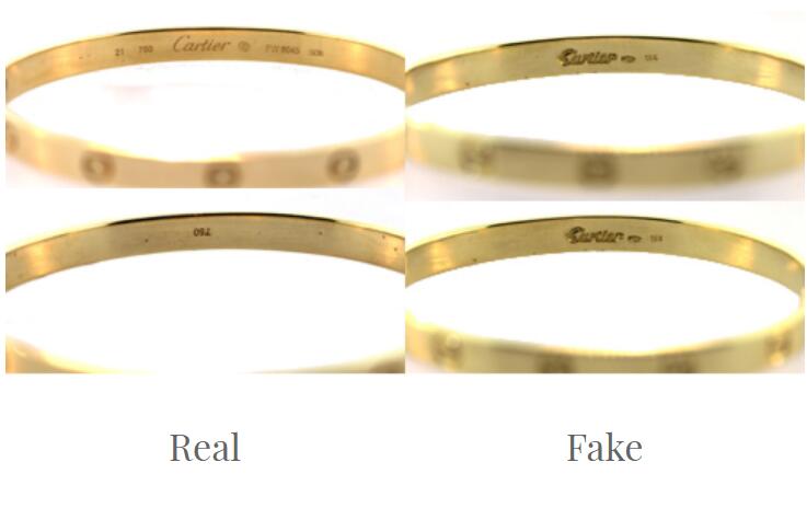 When you look at the stamps, these are not the same, the fake often has a smudged Cartier logo and uses an 18kt stamp rather than the Cartier’s “750”. Also, the fake’s stamp is not precise and is done quite carelessly. The real gold Cartier love bracelet’s markings should be readable, even, and smooth.