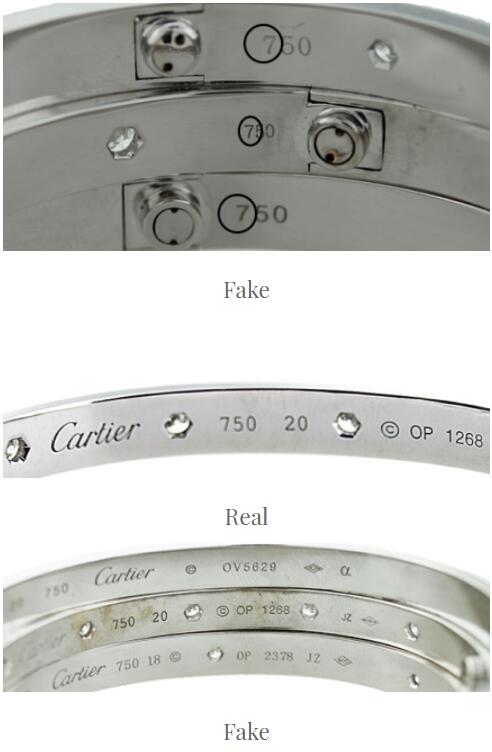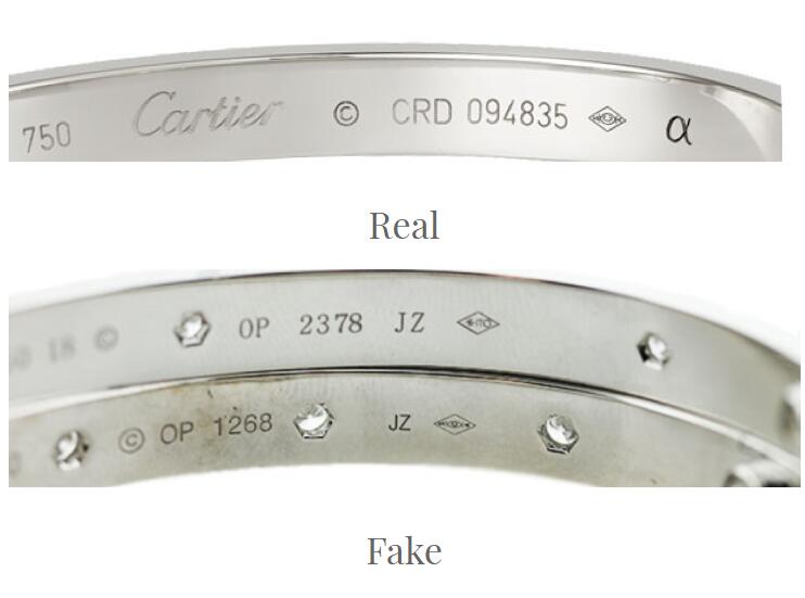 These replicas only loosely resemble the Cartier stamps. Below is the first example of how to spot a counterfeited Cartier Love bracelet.