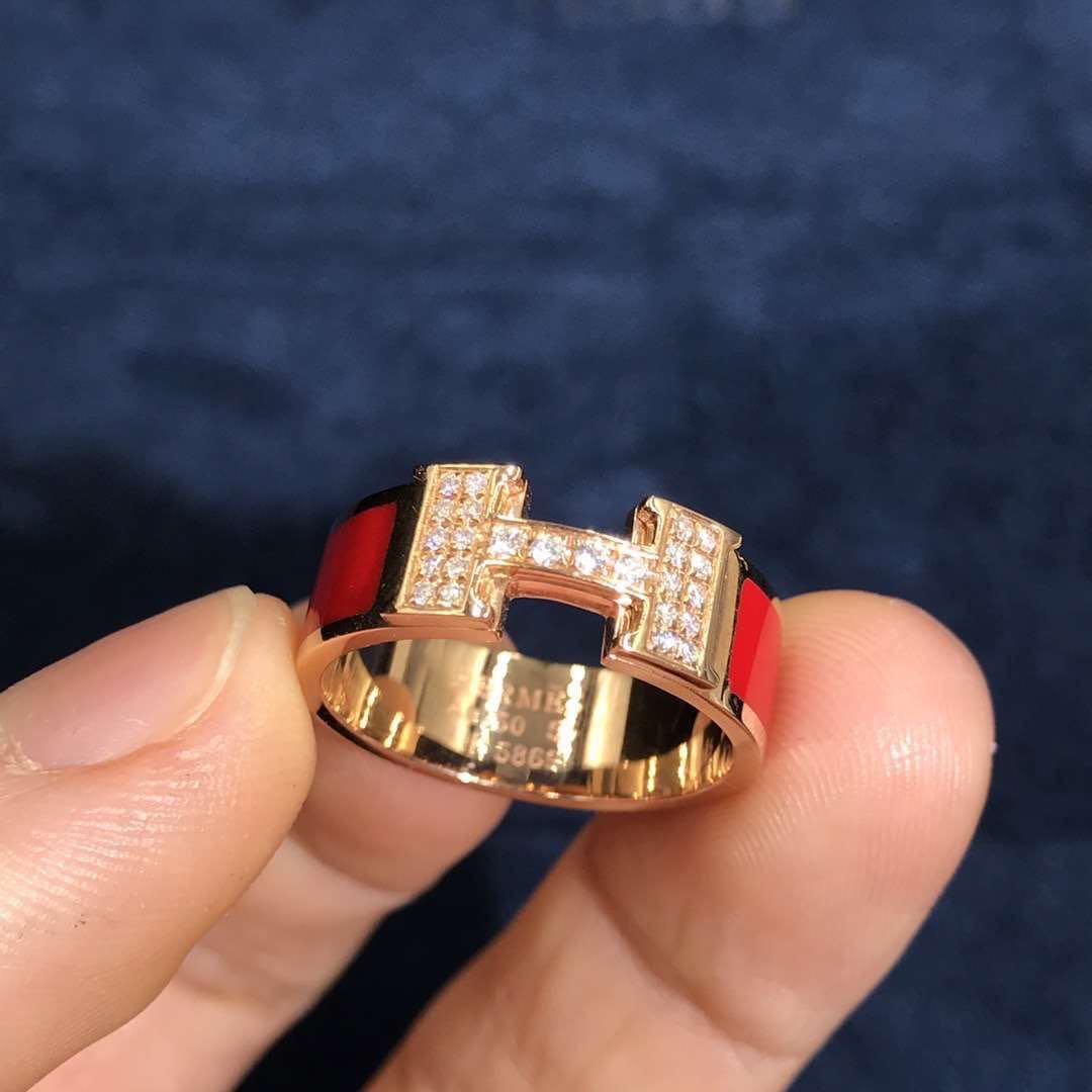 The "H" motif found in many Hermes designs is world renowned as well as synonymous withe the finest in luxury. This ring from the collection is made of 18K rose gold and is accented with a lustrous red enamel. Lastly, the "H" motif is set with a 0.20ct diamond pave.