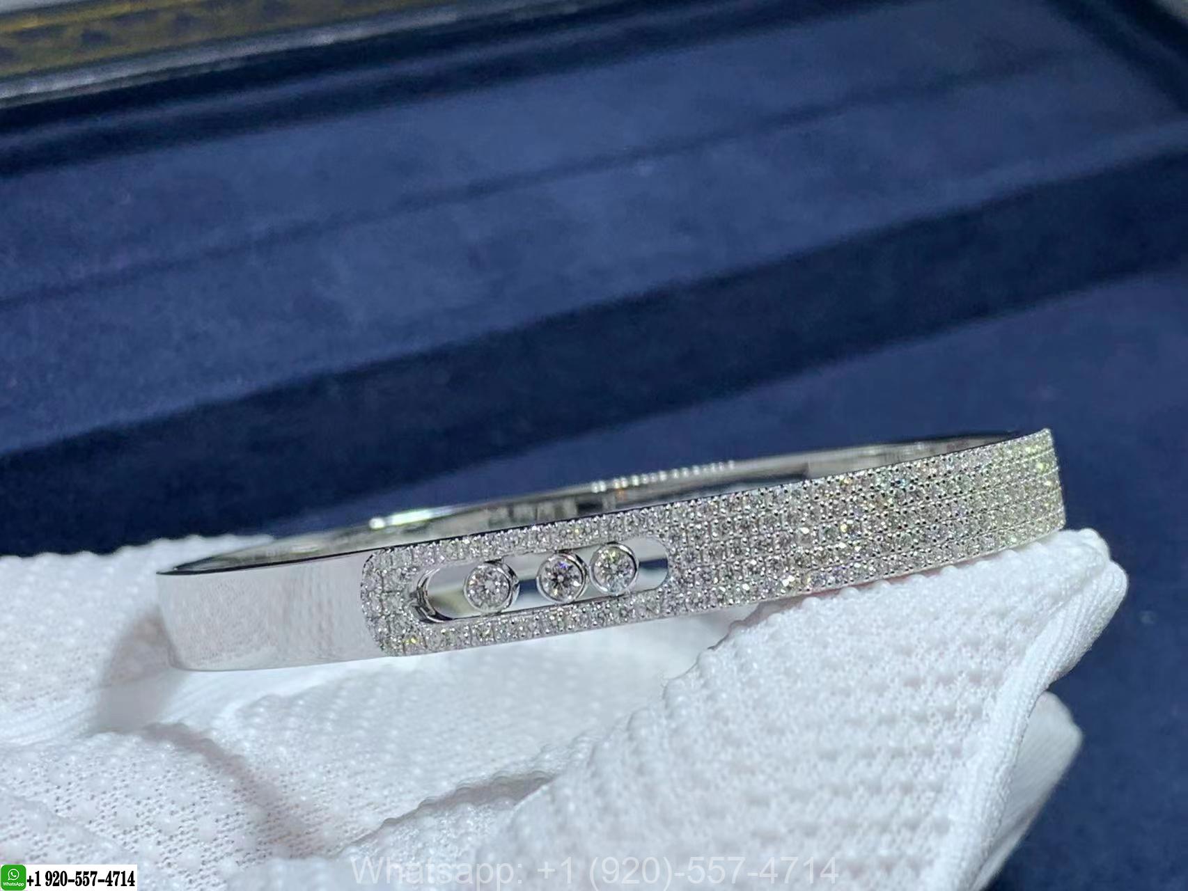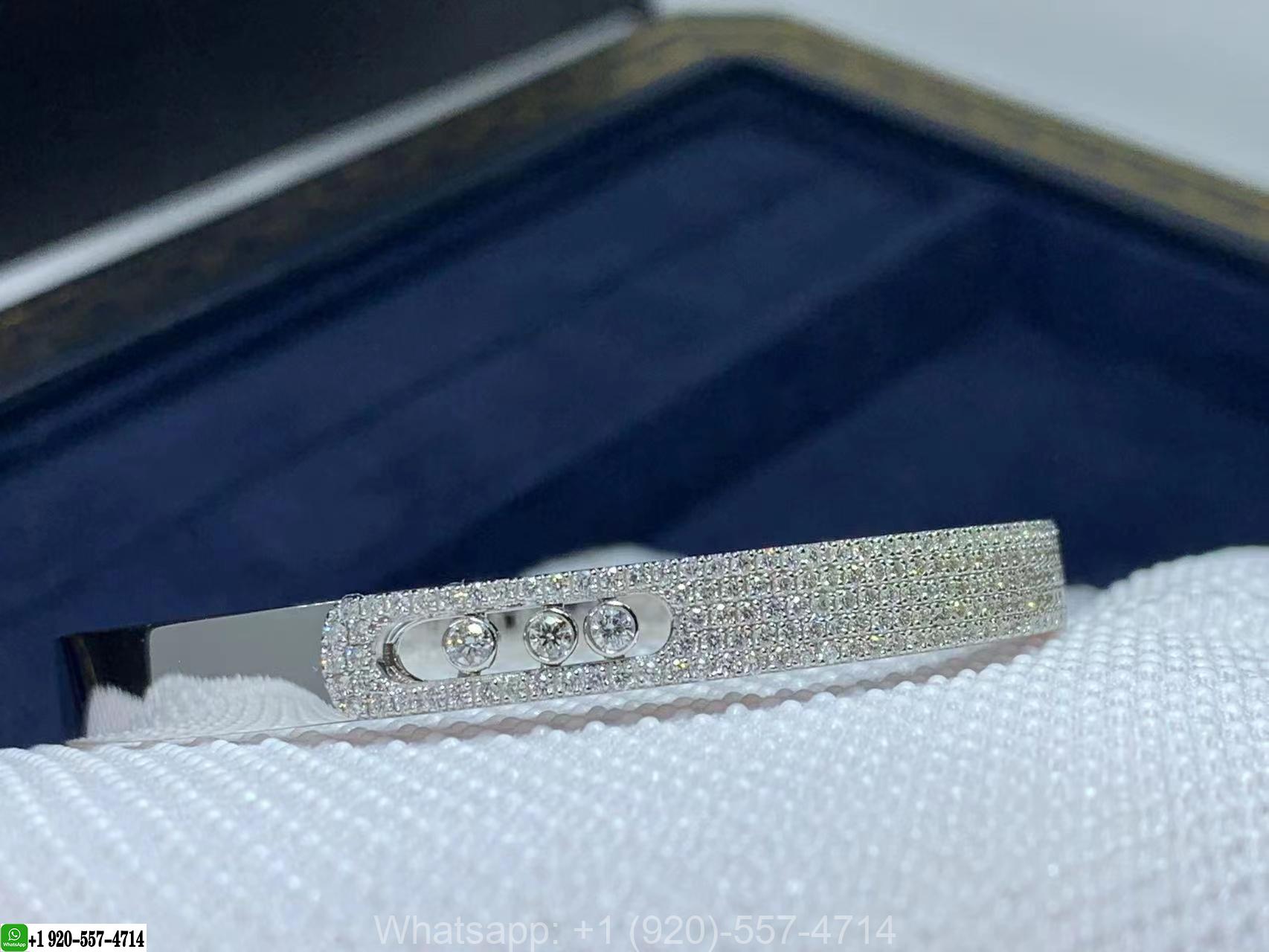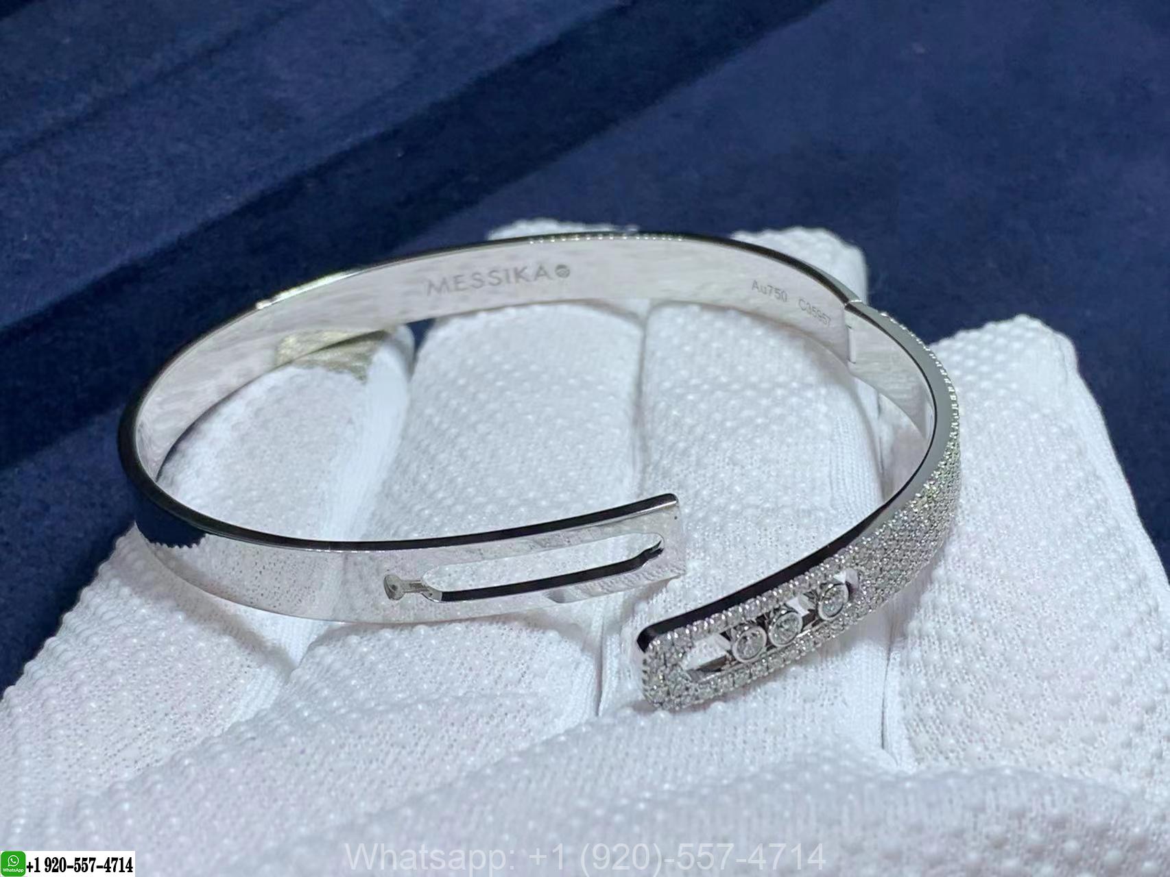 In this pavé version, this 8 carat white gold diamond bangle bracelet, fully handcrafted and set with three brilliant cut diamonds, is a piece of luxury jewelry Move, the signature line of Messika House. Like a gold ribbon, the Noa luxury bracelet for women also called bangle or slave bracelet gently wraps the cuff. The radiance of the white gold is balanced by a pavé blazing with light. Its timeless elegance, the three brilliant cut diamonds in motion, symbols of the love of yesterday, today and tomorrow make this white gold diamond bangle bracelet the everyday companion of a chic look as well as a casual one. The white gold harmoniously matches with with the precious moving gems, increasing the diamonds weightlessness effect. This Move Noa white gold diamond bangle bracelet can be worn alone or stacked with more Messika diamond bangle bracelets. Discover online Messika luxury jewelry creations and find the perfect diamond companion!