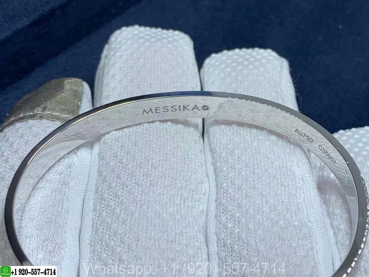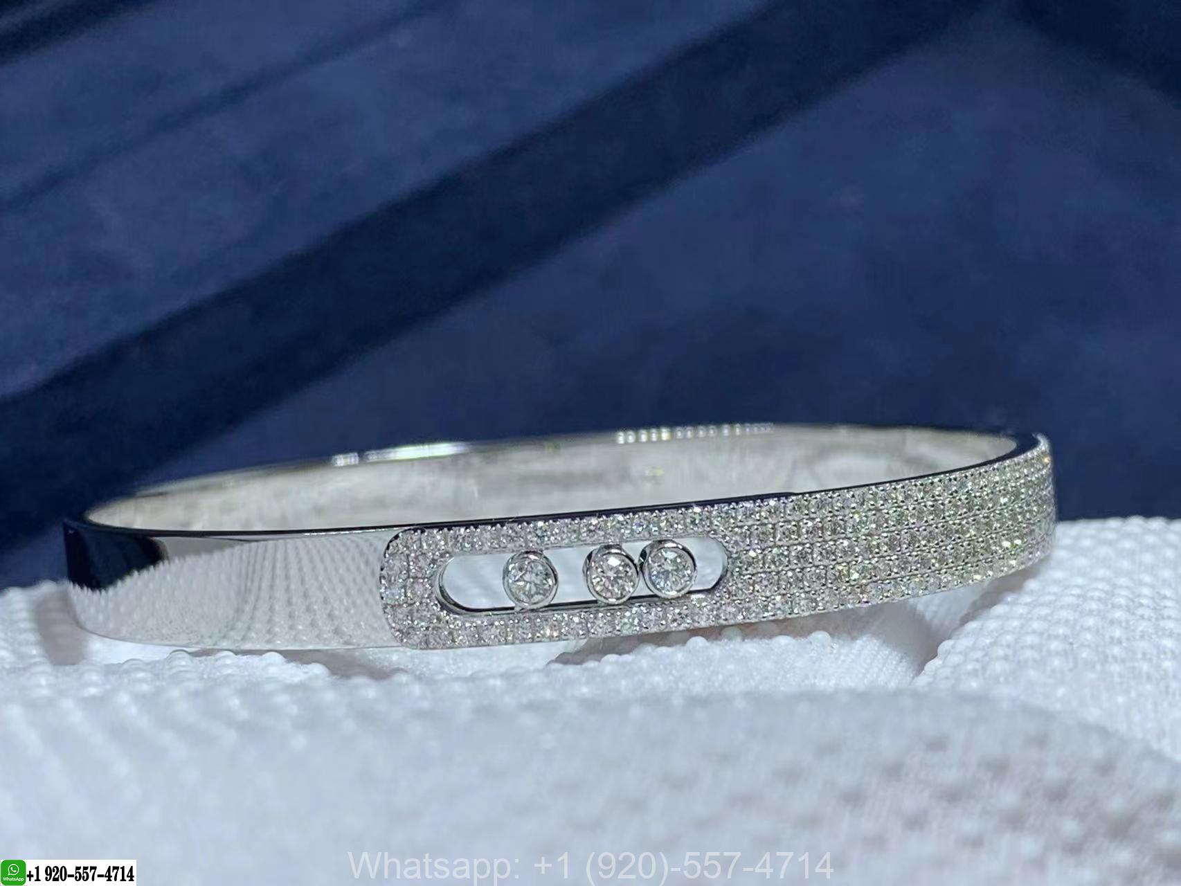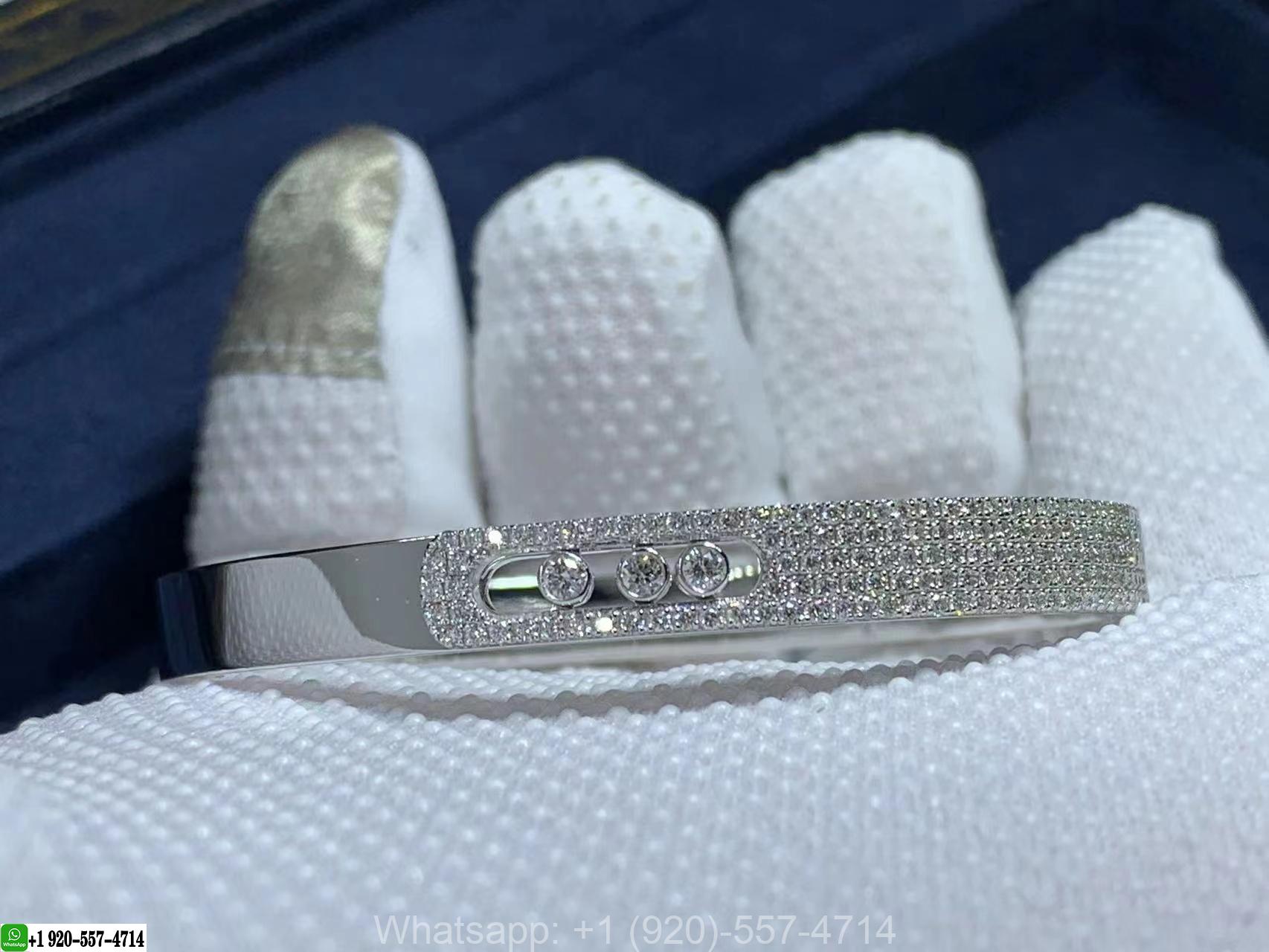 In this pavé version, this 8 carat white gold diamond bangle bracelet, fully handcrafted and set with three brilliant cut diamonds, is a piece of luxury jewelry Move, the signature line of Messika House. Like a gold ribbon, the Noa luxury bracelet for women also called bangle or slave bracelet gently wraps the cuff. The radiance of the white gold is balanced by a pavé blazing with light. Its timeless elegance, the three brilliant cut diamonds in motion, symbols of the love of yesterday, today and tomorrow make this white gold diamond bangle bracelet the everyday companion of a chic look as well as a casual one. The white gold harmoniously matches with with the precious moving gems, increasing the diamonds weightlessness effect. This Move Noa white gold diamond bangle bracelet can be worn alone or stacked with more Messika diamond bangle bracelets. Discover online Messika luxury jewelry creations and find the perfect diamond companion!