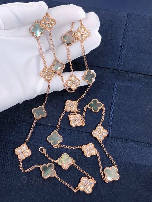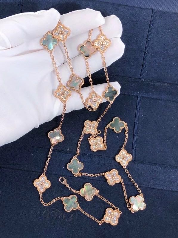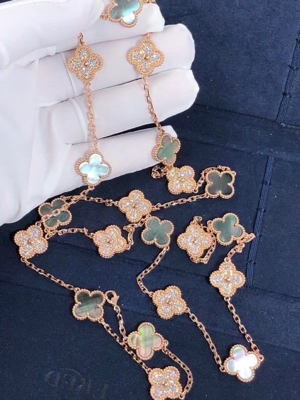 » 18K Gold Necklaces » Rose Gold Diamond Van Cleef Jewelry , Vintage Alhambra Necklace 20 Motifs