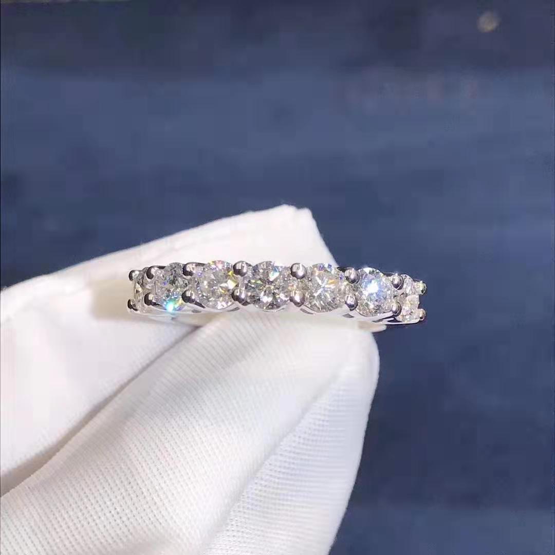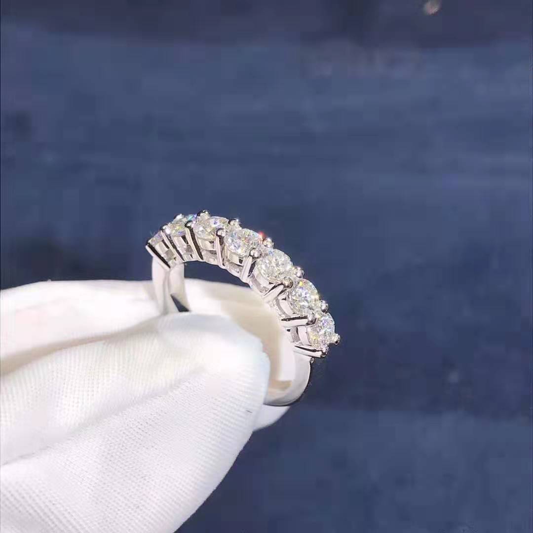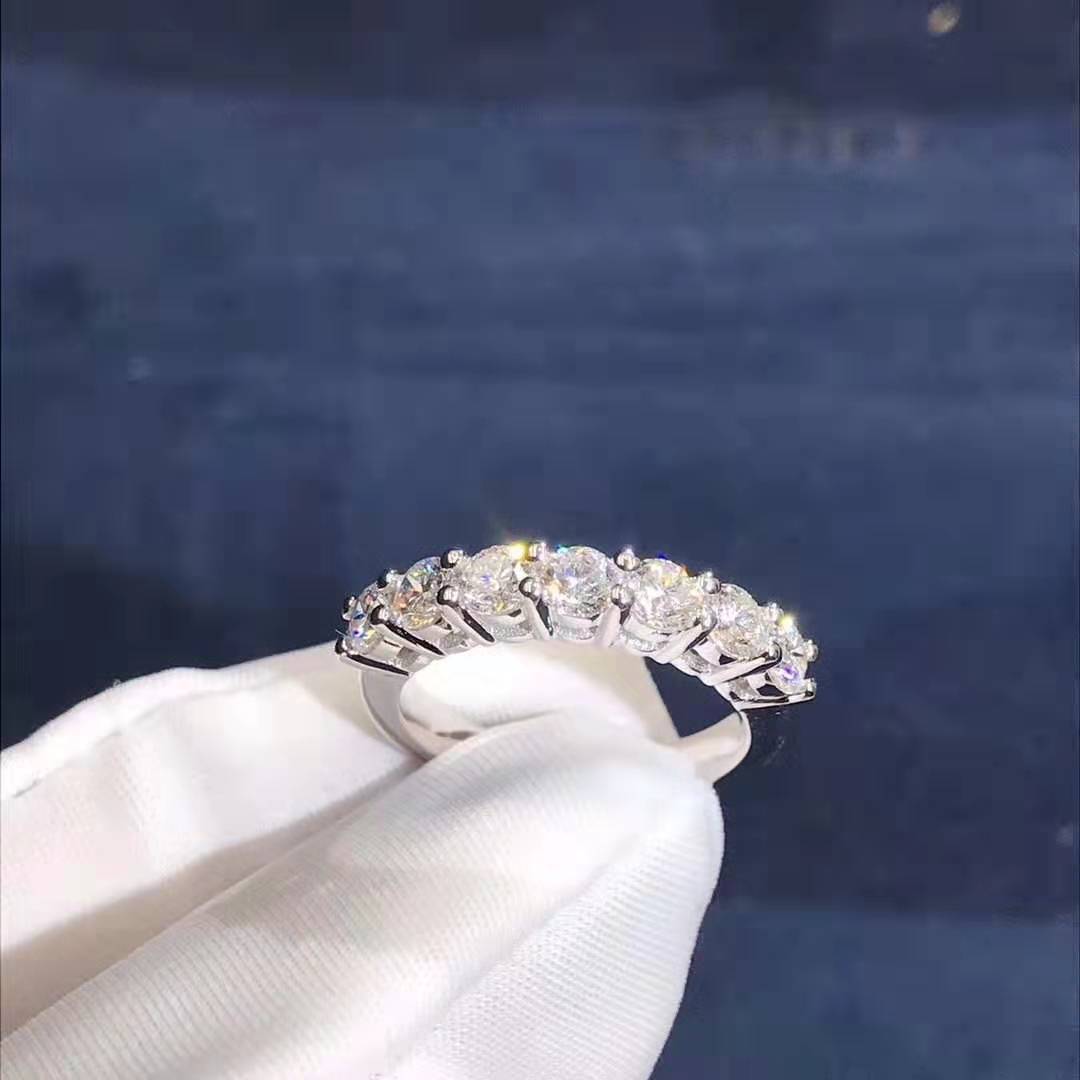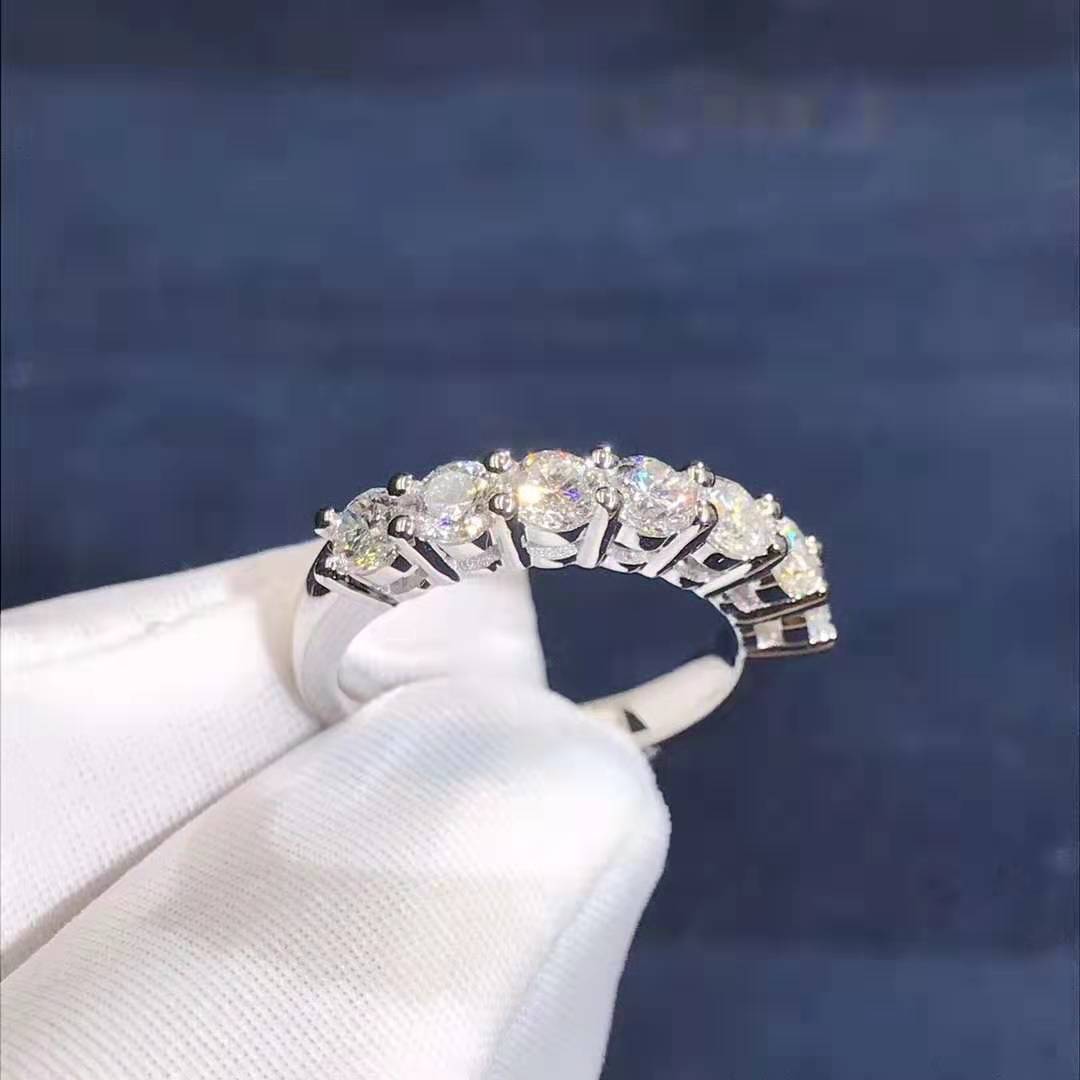 This elegant platinum ring features seven round diamonds around the silver band. Enjoy this classic wedding band from Tiffany & Co.