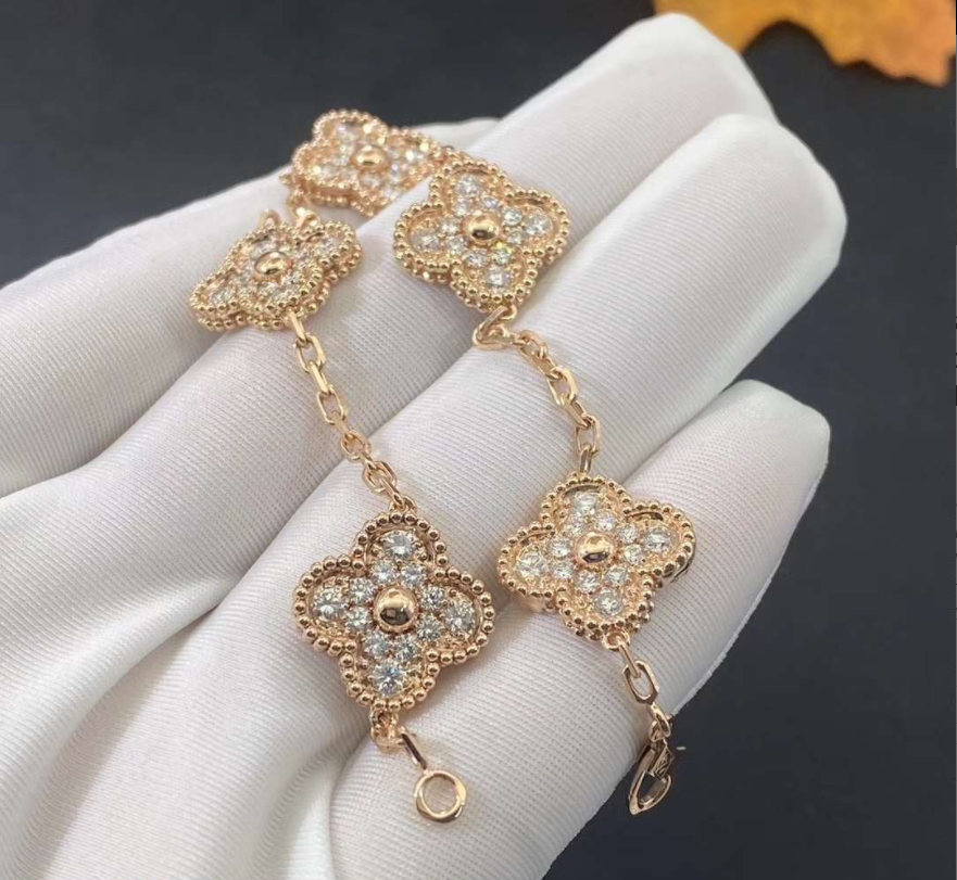 Vintage Alhambra bracelet, 5 motifs, yellow gold, round diamonds; diamond quality DEF, IF to VVS.