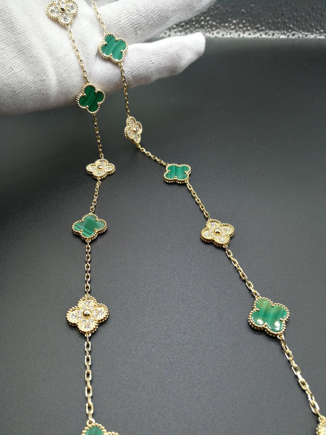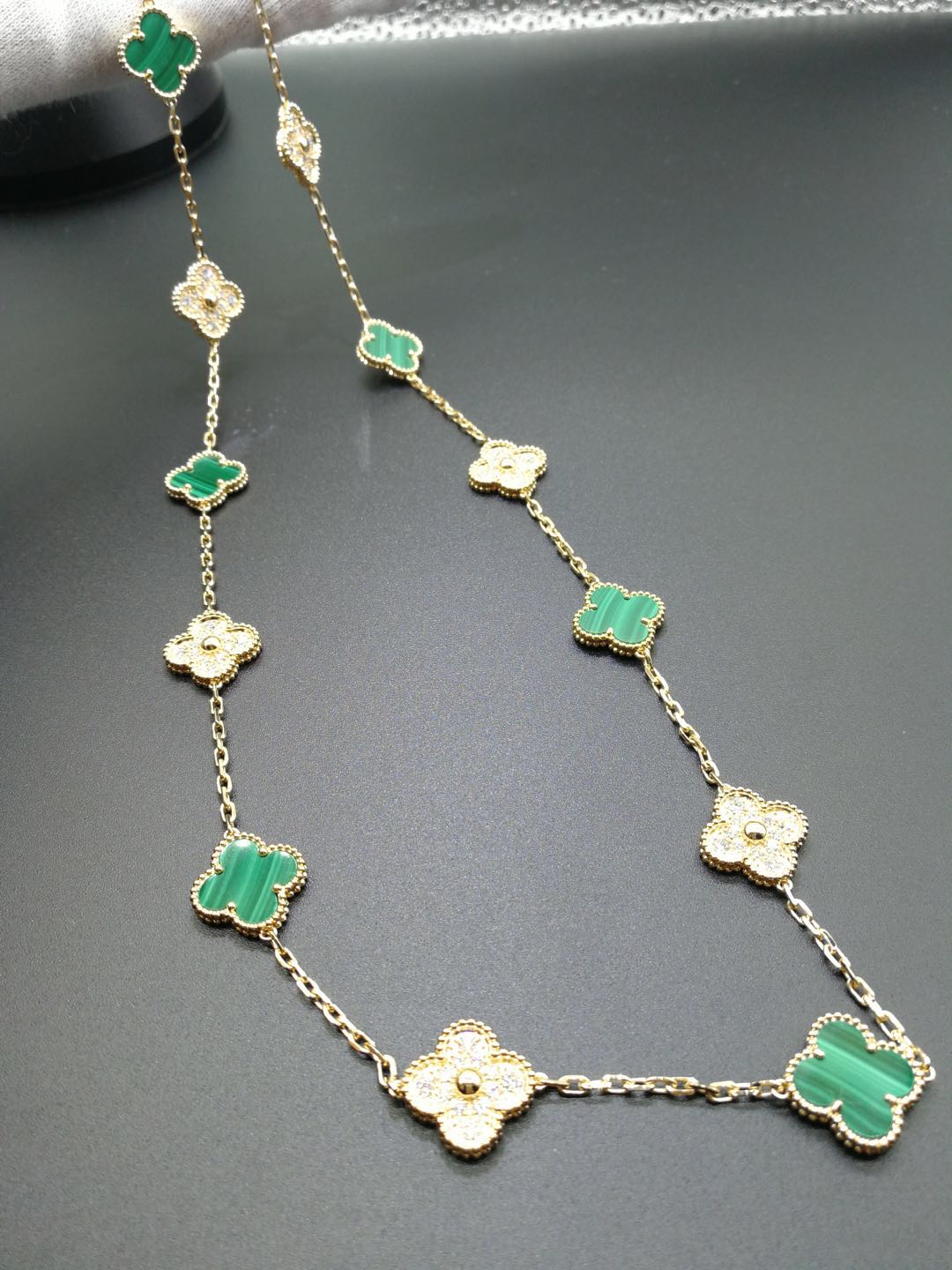 Van Cleef & Arpels Vintage Alhambra necklace, 20 motifs, yellow gold, malachite, round diamonds; diamond quality DEF, IF to VVS or any required.