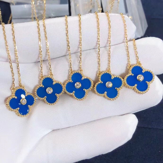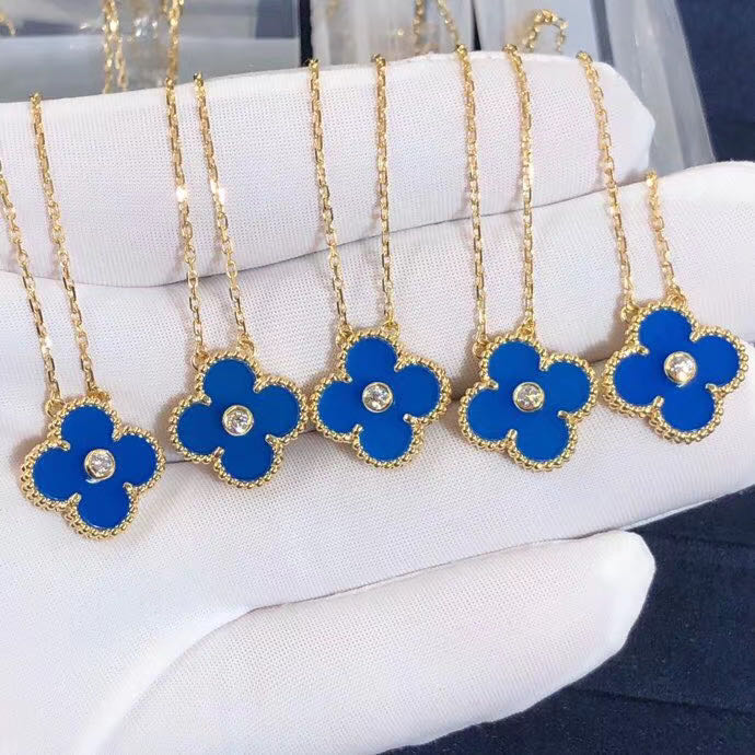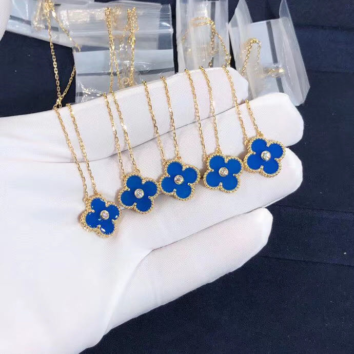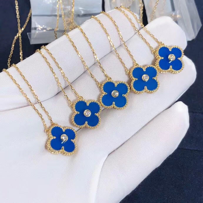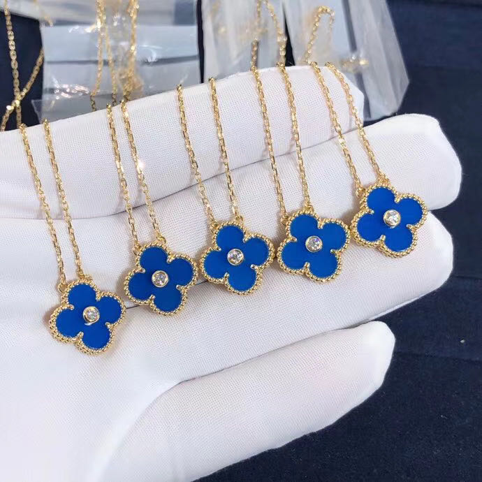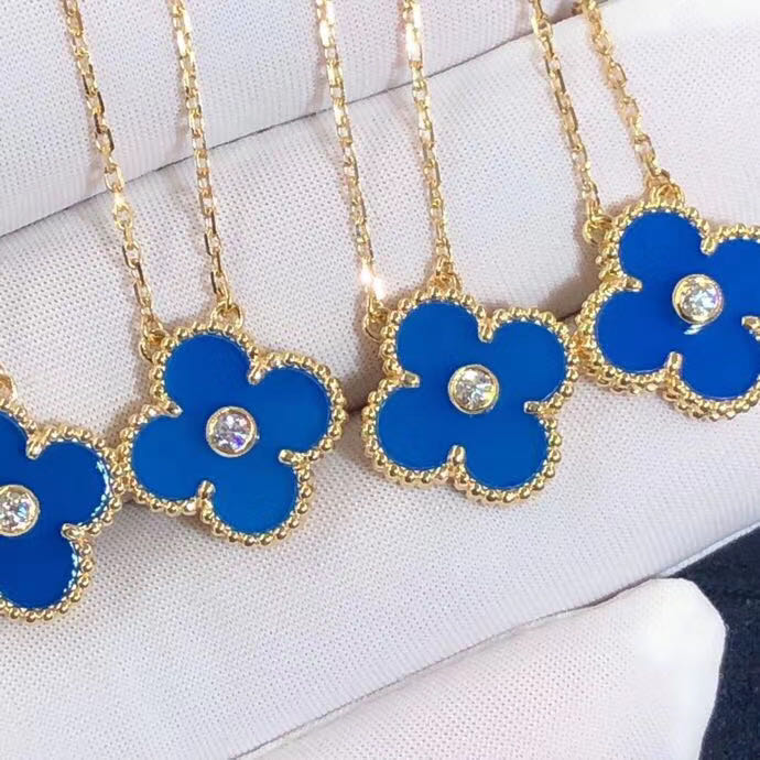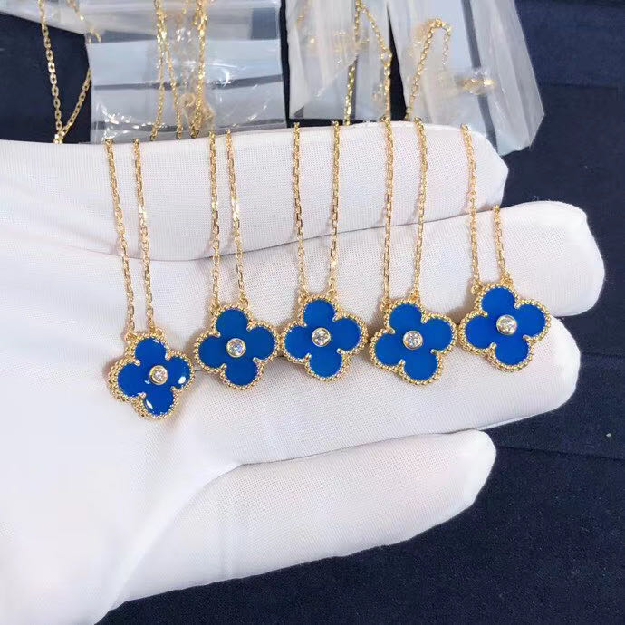 Vintage Alhambra pendant, yellow gold, Celestial Blue Sèvres porcelain, round diamond; diamond quality DEF, IF to VVS; limited edition.